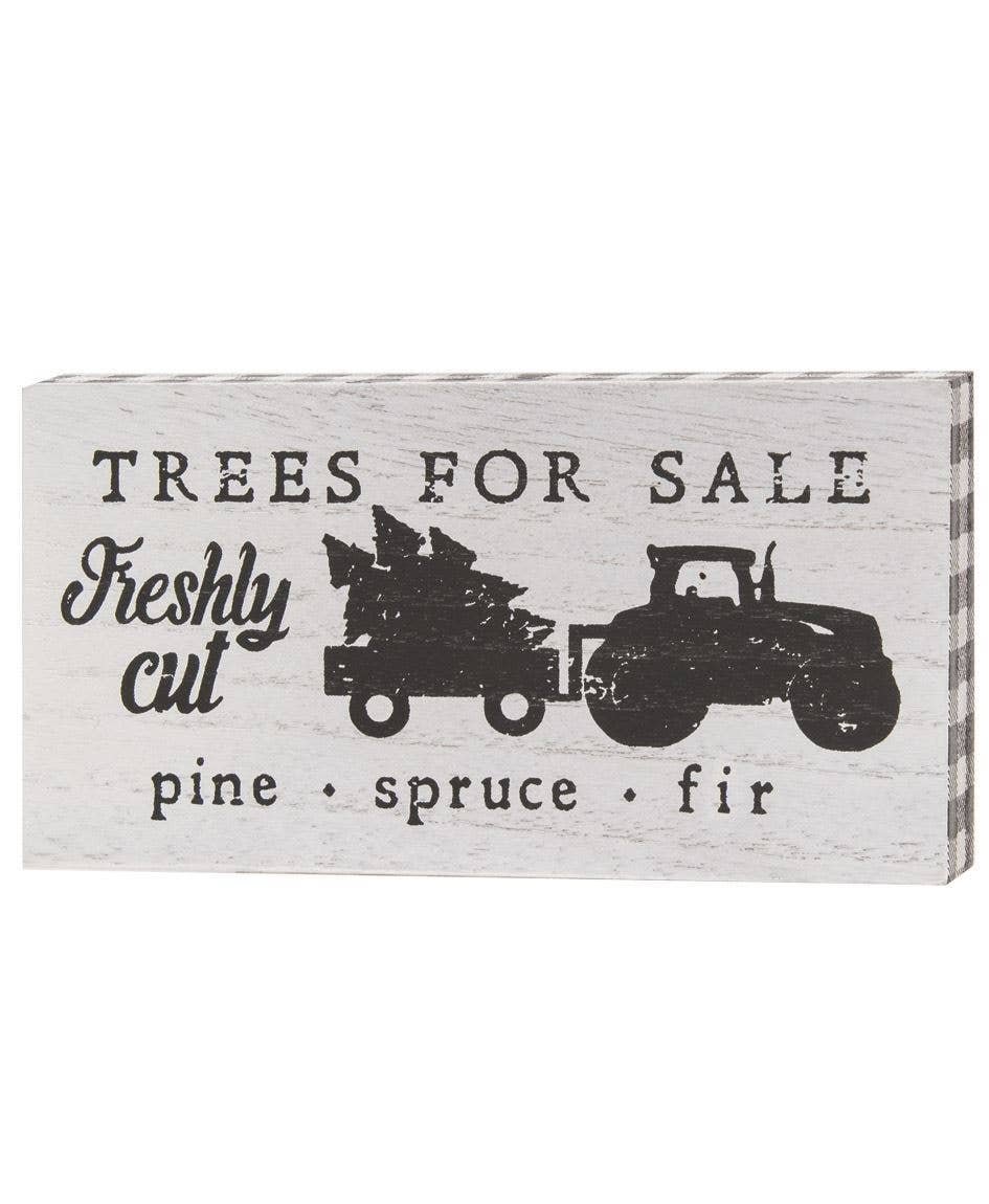 Farm Fresh Trees are freestanding wooden block accessories. They are painted white with a black and white check trim pattern around the border. The blocks feature black text that reads, "Trees for Sale, Fresh Cut, Pine, Spruce, Fir" and "Fresh Cut Trees, Cut and Carry". Measures 3"high by 6" wide by .75" deep. Please note: item features an assortment and are sold individually.